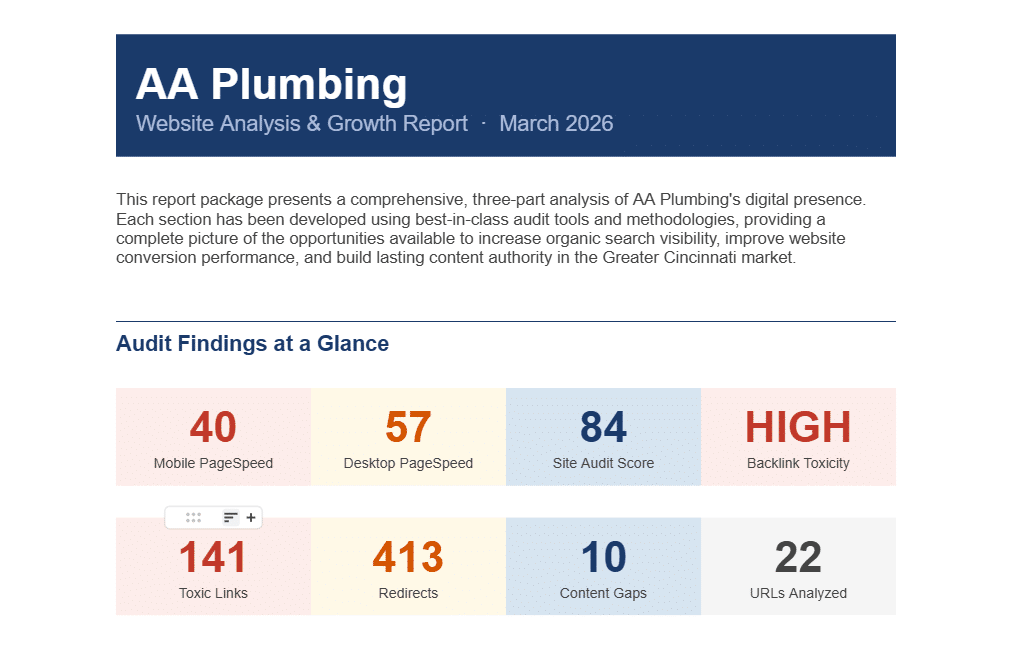 We Conducted a three-part digital audit for A&A Plumbing, a Greater Cincinnati plumbing company. The engagement covered conversion rate optimization, technical SEO, and content strategy, uncovering 24 CRO friction points, 8 critical technical issues, and 10 content gaps across 22 indexed URLs.